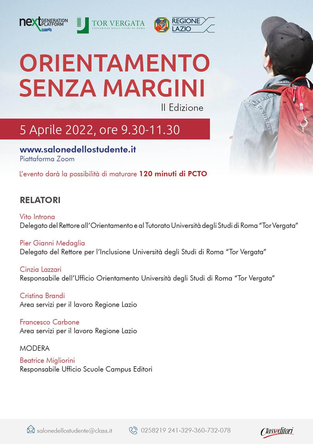 Per iscrizioni e informazioni è possibile cliccare qui: https://www.salonedellostudente.it/convegno-orientamento-senza-margini-5aprile/ o contattare l’Ufficio Scuole di Campus Orienta.